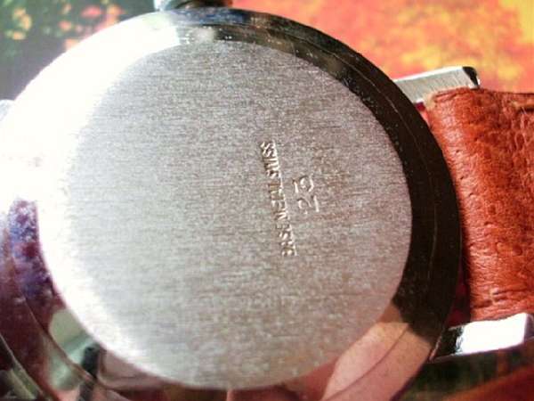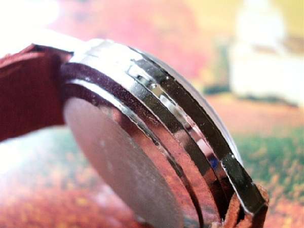 - おそらく未使用品として、店頭かコレクターに長期間保管されてきた逸品のようです。日常的な使用による傷に関しては、ほぼ無いといって良いほど、良好な保管状態です。ミッキーの両腕が、時計の長針、短針として回転する、「お約束」の機構とあいまって、不思議な魅力があります。保管中に、ケースのメッキや文字盤のコーティング、針等に、自然な経年変化があり、それが、いかにも味わいのある、趣味の良いアンティーク品の雰囲気を漂わせています。文字盤の表面には、「ホーローのようなつや」があり、薄いアメ色というか、ベージュ色になっていますが、このあたりが、良い雰囲気です。よくよく見ると、文字盤の右側のほうに、表面のコーティングの盛り上がりがあります。ケースには、美観を大きく損ねるようなメッキの剥離や目立つ傷は無いのですが、よく見ると、メッキの経年変化による微細な粒状化や保管中に発生したと思われる接触跡はみられます。しかし、少し離れて見れば、こうした変化は認識が困難なレベルだと思い、むしろ、この時計の希少性を考慮すれば、避けられないと思います。街の高級アンティークショップで、いかにも新品ピッカピカのような状態の、アンティーク品のミッキーマウスウォッチを見かけることがありますが、この一品は、再メッキしているわけではく、オリジナルなので、このような経年変化も止むを得ないと思われます。ベルトと尾錠は、さすがに原型が残っていないので、未使用の汎用品の新品を着けておきます。ほかに付属品はございません。ちなみに、アンティウオッチマンで過去に、「商品番号H-4639」として、55,000円で販売されたものと同種の時計です。