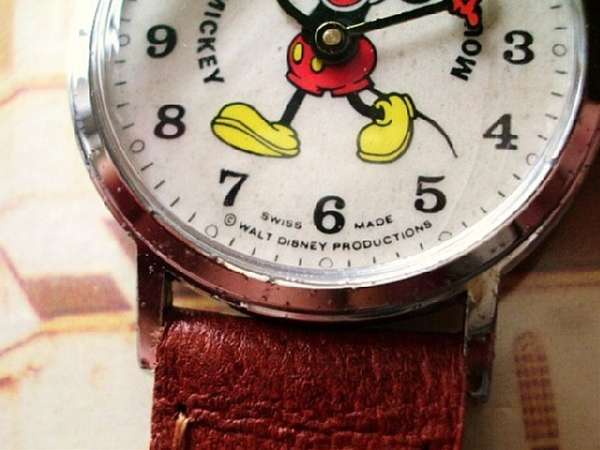 - ディズニー社の正規キャラクターウオッチの王道、ブラッドレー社の製造した、ミッキーマウスの時計です。かなり古い年代のようです。通称「オールドミッキー」ともいわれているようですね。ミッキーの顔や体のプロポーションが、ウォルトディズニーの初期の頃の、なつかしのデザインで、目が「パイ アイ(Pie Eye)」つまり、丸いパイを部分的に切り取ったような形です。又、動体が、「胴長」になっています。文字盤上に、MICKEY MOUSE、WALT DISNEY PRODUCTIONS、SWISS MADEと書かれており、製造会社のBRADLEYのブランド銘の記載もある、高級スイス製の正規生産品です。