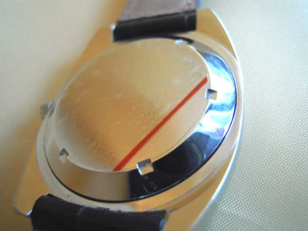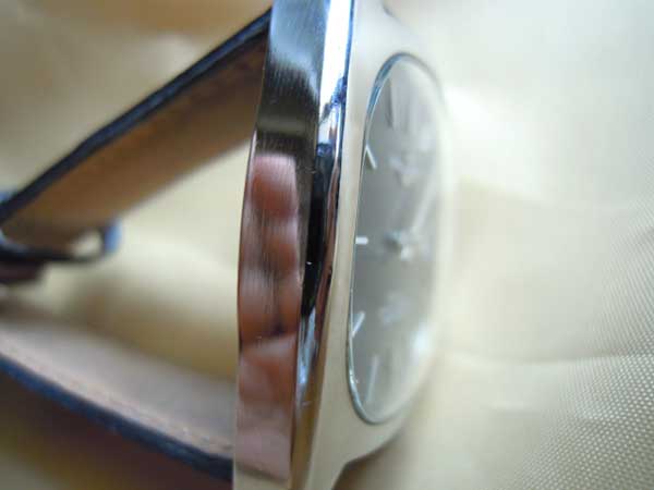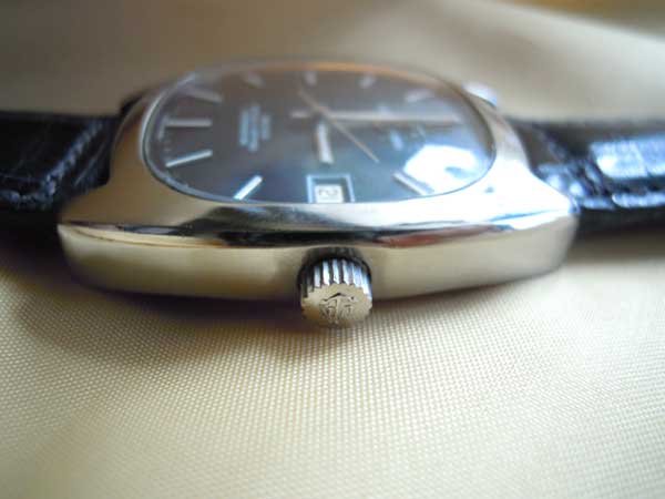 - 立体的なアップライト式のイカリのエンブレムとインデックスバーが文字盤に誇らしく輝いておりカッコイイです。イカリのマークはリュウズにも記されています。この当時、IWCやジャガールクルト等と、スイス高級時計界ではライバル関係にありましたが、元来ユリス・ナルダンといえば、1846年スイスのル・ロックルで創業し、ミニッツリピーターやマリンクロノメーターで名声を博しており、第一次世界大戦では各国の海軍の軍艦にもクロノメーターを供給していましたので、スイスの時計界においても歴史的経緯が豊富な部類に入ります。このナルダンのクロノメーター規格の自動巻き腕時計は、ケースのデザインはIWCのヨットクラブ(YACHT CLUB)や、ルクルトのメモボックス(MEMO VOX)等の一部のモデルを彷彿とさせますが、これは、その当時の時代的流行のデザインといえましょう。最近では、ユリス・ナルダンは、雲の上の頂上ブランドとして、しっかりと復活しており、単価1000万円を越える天文時計の3部作アストロラビウム・ガリレオ・ガリレイ(Astrolabium G.Galilei)1985年、プラネタリウム・コペルニクス(Planetarium Copernicus)1988年、テルリウム・ヨハネス・ケプラー(Tellurium J.Kepler Limited)1992年 で名声を博し、2001年には、全く新しいタイプのトゥールビヨンシステムのフリーク(Freak)を発売し、世界中の時計コレクターをアッと驚かせました。