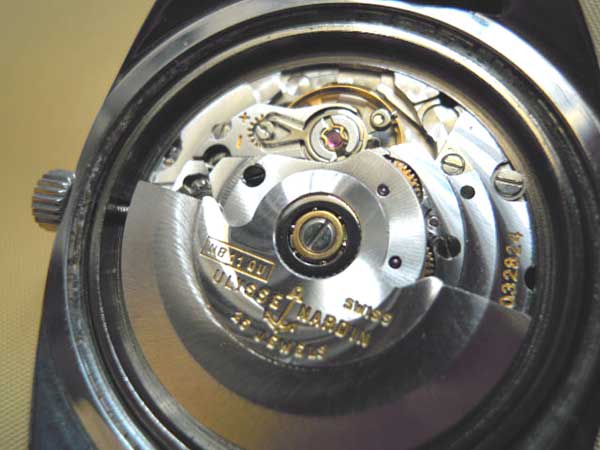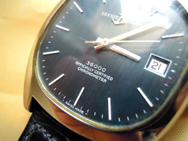 - 自動巻。1970年代に少量生産された、ユリスナルダン製25石仕様の高級自社ムーブメント キャリバー「Ulysse Nardin NB11QU」を搭載。日付の早送りも可能で、手巻も可能な仕様であるため、実用的です。高級仕様ゆえに、ムーブには、製造番号(032***)も刻印されています。(下3けたは伏字としています)文字盤に「36000」「OFFICIALLYCERTIFIED CHRONOMETER」と記載の通り、公認クロノメーター規格の上級仕様です。尚、10振動つまり36000ビートのムーブメントは、1960年代頃に、精度を高める手法としてビート数を上げることが有効のため一部の高級ムーブメントで実現されており、例えば、モバード、ゼニス、セイコー45系及び61系のグランドセイコーが、それにあたりますが、高いコストの関係等により、現在でも生産されているのは、世界中で、セイコーの一部の手作り工程の機械式と、ゼニスのエルプリメロくらいです。