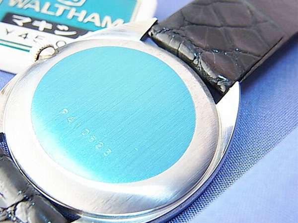 - 1850年創業のアメリカで最も古い歴史のあるウォルサム。過去に経営者の交代や社名変更を経ており、例えば「American Watch Company」等の社名であった時期もありましたが、1885年に「Waltham」が社名として定着し、1950年代には本拠地をスイスのニューシャテルに移して活動を継続しておりました。創業以来、ウォルサムの高い品質には定評があり、19世紀には世界中の鉄道会社でウォルサムの懐中時計が採用され、とくにアメリカでは、ハミルトン、イリノイ等と並んで、いわゆる鉄道時計の代名詞ともいわれており、更に、20世紀の初頭に生産された「リバーサイド」の23石キャリバーは、懐中時計ファンの間では垂涎の的とされ、状態の良いものは20万円から30万円ほどの高額で取引され、更に、第一次、第二次世界大戦では、イギリス軍やアメリカ軍もウォルサムの品質を高く評価していたため、例えば、イギリス空軍用の時計や、タイプ11やタイプ17といったアメリカ軍のウォルサム製の時計は、ミリタリーウォッチのマニアの間では有名な時計です。今回の出品の時計は、気品のある白い文字盤にはローマ数字が並び、リュウズには「W」のエンブレムが輝いており、いかにも高級時計のオーラを放っております。カットガラスは、見る角度により光をキラリと反射させて美しいです。古い値札がついており、発売当時の価格として、45,000円の金額が印刷で記載されていますが、例えば、この当時の初任給は現在の約半分程度、およそ10万円前後であったと思われますので、現在の経済価値に換算すると、例えば10万円前後の高級時計に相当すると思われます。