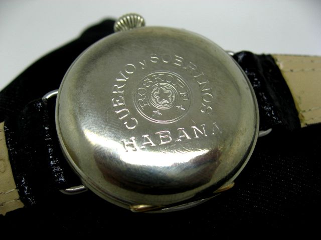 裏蓋にはしっかり『HABANA』の文字もあり、葉巻の輸出と世界中のセレブの避寒地として栄華を極めた当時の『HABANA』が偲ばれ、とてもよい雰囲気です。二重底になっている裏蓋の内側にはムーブメント保護のためガラスカバーがついています。針の調整も竜頭を持ち上げるのではなく。2時の突起を押しながら回す、珍しい構造となっています。