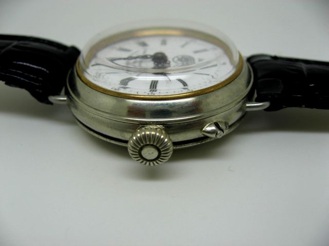 時計、ベルト、尾錠以外の付属品はありません。 ダイヤル(文字盤)の6時位置に軽いクラックがあります。文字やメモリは経年的に薄くなっている箇所もあります。軽いシミ、微細な毛羽の混入も認められます。2時位置にある右肩のポッチを押しながらリューズを回すと針が動いて時刻調整が出来ます。