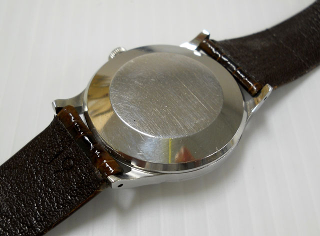 裏蓋にはパッキンが入り、ステンレスの防水スナップバックケース、竜頭には魚マークが入っており、発売当時の防水性をさり気なくアピールしております。