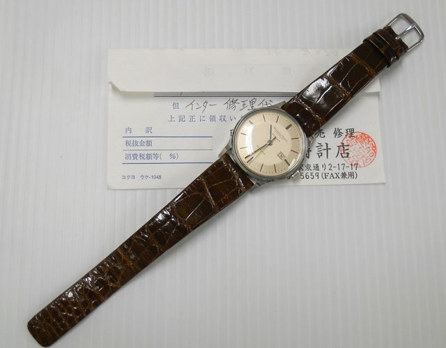 時計本体はワンオーナー物で、先日に整備を完了(修理時領収書付属)致しておりますので、末永くご愛用戴ける時計です。ストラップ、尾錠は社外製になります。