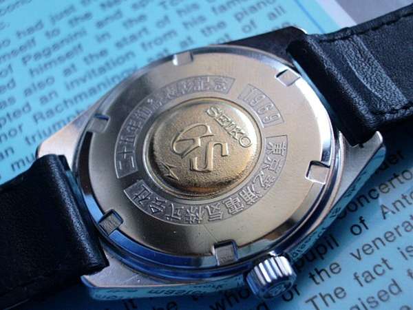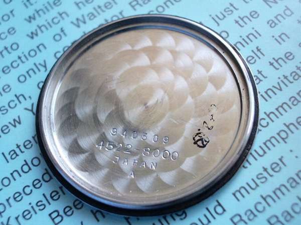 セイコーコレクターの皆様には、申し上げるまでもない有名なエピソードですが、時計精度のコンクールとして権威ある、スイス・ニューシャテル天文台コンクール、ジュネーブ天文台コンクールで1960年代後半、上位独占を果たしたセイコーは、その技術力を活用して、この45GSには、なんとスイス・クロノメーター基準よりも厳しい自社「GS検定基準」をクリアして市販しました。なお、更に稀少価値として、この個体は、東芝が勤続25年のベテラン社員に支給していた貴重な「別注モノ」であり、裏ぶたが特注品です。例えば個人名の刻印であったり、企業物でも簡易刻印であった場合には、その品の価値が下がってしまう場合もありますが、この時計には、写真のように、本格的な製造方法で、東芝の記念品であることが正規刻印されています。昔、東芝がグランドセイコーを支給していたことは、グランドセイコーマニアの間では周知の事実ですが、そうした時計が、ほとんどの場合、あまり使いこまれずにキレイな状態のままの事が多いので、この刻印があることで、むしろ、この個体が由緒正しいものであることの証拠となりえます。