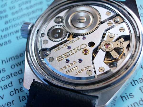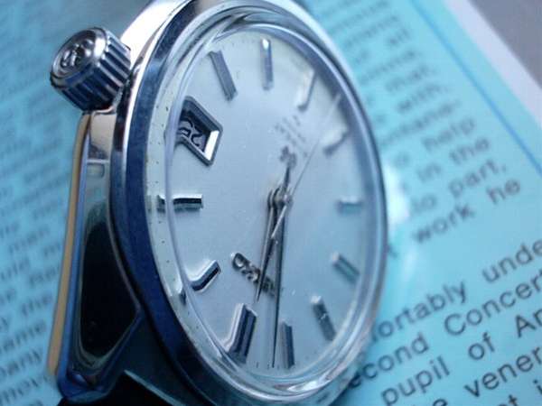 1969年製。手巻式 日付カレンダーつき 4522A。諏訪精工舎(諏訪セイコー)や第二精工舎(亀戸セイコー)が、スイスの天文台コンクールで好成績を挙げた時代の、傑作機です。稀少なハイビートの10振動(36000ビート)モデル、25石の自動巻ムーブメント。100万円近くで取引されることもある、グランドセイコーVFAは、このムーブメントがベースになってます。最近、ますます流通数が少なく入手困難になりつつある、「45GS」をお探しの方にはおすすめです。手巻式ゆえに、リュウズが大切ですが、「GS」マークのリュウズに触れるたびに、やはり良い時計だと感じられて、感慨もひとしおです。尚、この45GSに搭載されたキャリバー、「4522A」は日付カレンダーつきで、日付は早送り可能であり実用的です。10振動という事だけを考慮しても、これまでにゼニスのエルプリメロ、ロンジンの400系などの一部の例外的な高級機しか採用されていない仕様であり、最近では、コスト面などから8振動が主流ですので、歴史的に価値ある機械です。文字盤にも、10振動、36000ビートを意味する「36000」が誇らしく記載されています。