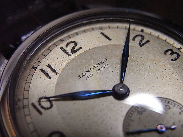 - 1940年年代の ロンジン ステップドベゼルモデルを出品いたします。大変珍しい耐磁モデルとなります。ご存知の通りこの時代のロンジン社は堅実なムーブメントを自社開発していたマニュファクチュールとして知られていたメーカーです。この時計に搭載されているムーブ10.68も、元々耐磁性能を懐中時計の時代より受け継いできていますが、その性能をダイヤルにNO-MAGと明確に表記しているのは本当に珍しい事です。当時のムーブメントの代表作といっても過言ではないものです。(個人的にはパテックのムーブメントにも負けない美しさだと思います) ダイアルは時代の経年変化は感じるもののシャンパンゴールドのツートン(光の向きにより見え方の異なる美しい)ダイアルとなっており、またケースも大変堅固なステンレスのステップドベゼル仕様です。スクリューバックになっています。1940年代のこの時期のほんのわずかな期間にのみ作られた大変レアなモデルです。