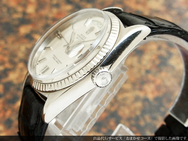 - ロレックスのオイスターパーペチュアルの最高峰、ホワイトゴールドの18金無垢のデイデイトモデルです。ロレックスは耐久性を考えたスペックと高精度のムーブメントの開発という時計にとっての永遠のテーマに立ち向かい、不意の衝撃や水気から守るために開発されたオイスターケースやねじ込み式リューズの開発という偉大な功績を残しました。また、この時計のように腕の僅かな動きで作動する自動巻き機構であるパーペチュアルを誕生させ、一躍時計業界の先駆者的な存在となりました。ベーシックで完成されたスタイルは世代を超えて愛され続けています。質の高いパーツを使用したこちらのオイスターモデルは、1950~80年代頃のロレックスの黄金期を支えたモデルで現行品には真似できないアンティークの素晴らしさを持っています。こちらはオイスターのデイデイトモデルです。1956年にファーストモデルが製造され、このRef.1803は1960年代頃に製造されたセカンドモデルになります。搭載ムーブメントはロービートの自動巻きキャリバーCal.1555です。ロービートならではのゆっくりと滑らかに運針する姿はアンティークの醍醐味かと思います。また、ムーブメントに余計な負荷を掛けないので耐久性の向上にも繋がっており、大切に使えば何年にも渡り動き続けるであろう安定感があります。ダイヤルはモザイクパターンの高級感のある文字盤です。外周が1段下がって中央が浮き出て見える、現在では存在しないコストの高い高級立体仕様を採用しています。18金ホワイトゴールド無垢のケースは独特の重厚感があります。シルバーダイヤルと相まって、落ち着いた上品な仕上がりです。裏蓋の内側に18Kの刻印があります。2014年8月にとった日本ロレックスの見積書、時計店でのオーバーホールの納品書(平成23年5月8日と平成25年2月19日)、BOXとカタログが付属します。シンプルで落ち着いた雰囲気の中に温かみのある質感や高級感が感じられるヴィンテージモデルです。
