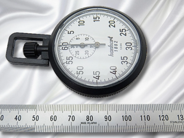 今回ご紹介するのはハンハルトのアナログストップウォッチです。2000年代に製造された「クラウンストッパー」タイプ。ピンレバー式の1石機械式ムーブメントを採用し、1/5秒単位で最大30分まで計測が出来る仕様です。軽量で扱いやすく、工業用途や教育現場など、正確な時間計測が求められる多様なシーンで活躍します。